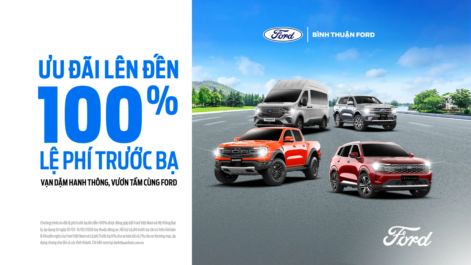 Xem đầy đủ thông tin chương trình khuyến mại xe Ford mới nhất tháng 3/2026 "VẠN DẶM HANH THÔNG, VƯƠN TẦM CÙNG FORD" tại đây